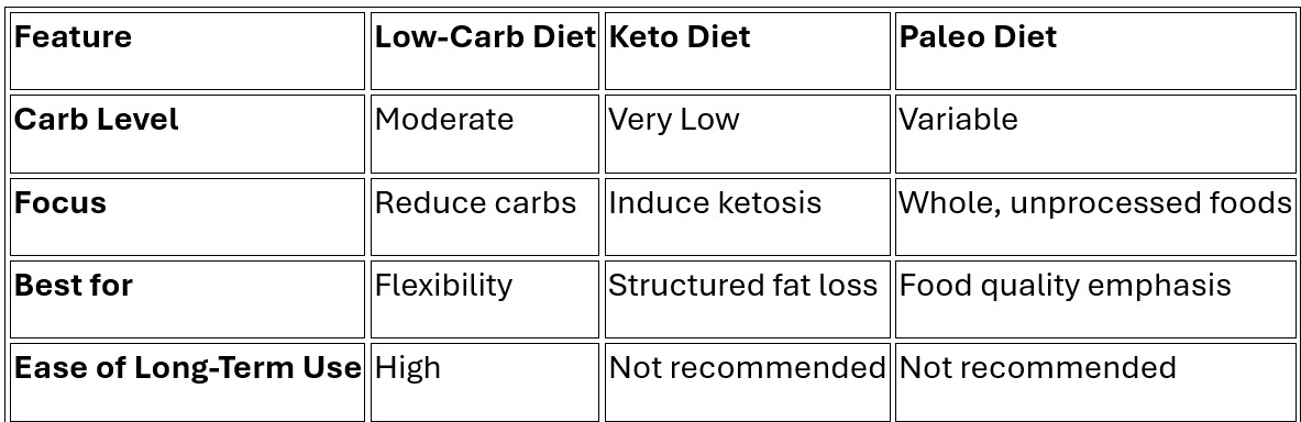 When it comes to low-carb vs keto for weight loss, keto may lead to faster short-term results, but low-carb is often easier to maintain. Keto vs paleo differs mainly in carb restriction intensity and food rules.
